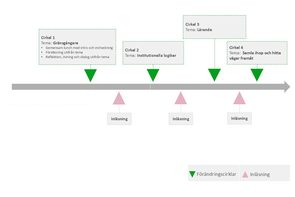 Infografisk tidslinje som illustrerar fyra förändringscirkelträffar med olika teman. Mellan dessa träffar finns utrymme för individuell inläsning inför kommande träff.Förstora bilden