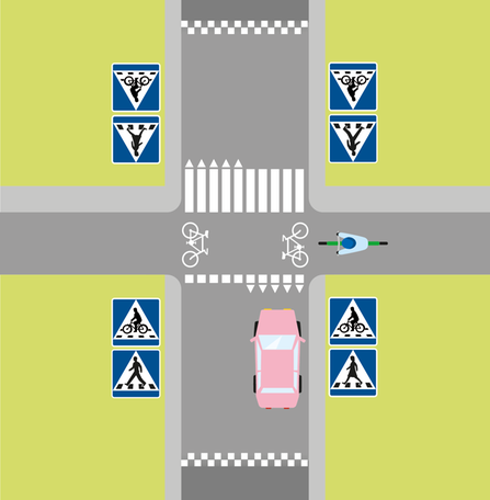 Vid en cykelöverfart har fordonsförare väjningsplikt mot cyklande och förare av moped klass II som är ute på eller just ska färdas ut på cykelöverfarten.