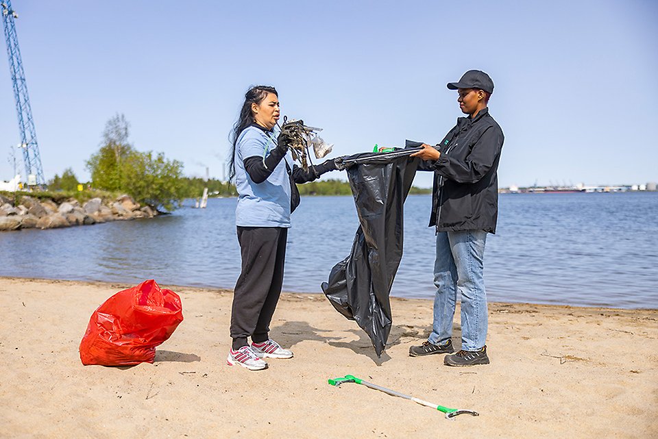 Olof och Khadar hjälper varandra att städa längst Umeå kommuns havsstränder. Foto: Fredrik Larsson