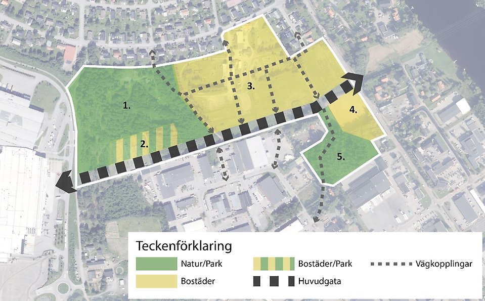 Programområdet utgör idag en till stor del outnyttjad yta mellan villaområdet i norr och industriområdet i söder. Planprogrammet medför att delar av detta område [3] och [4] (se bild ovan) exploateras med bostäder. Utöver detta bevaras all befintlig skog i väster som ett natur- och parkområde [1]. I sydöst [5] har även det befintliga höjdpartiet Skurkläppen sparats som grönområde.