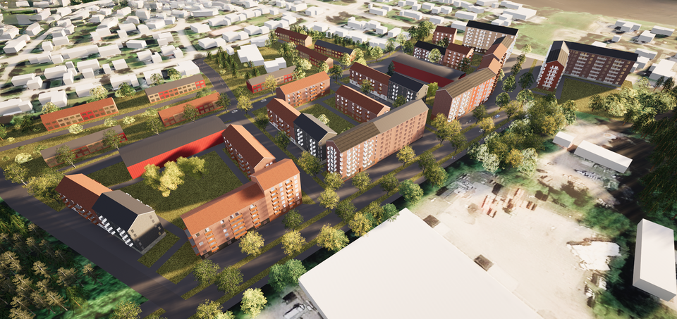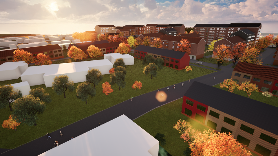 Illustration som visar ett exempel på en möjlig struktur samt volymer sett från Söderslätts bostadsområde.
