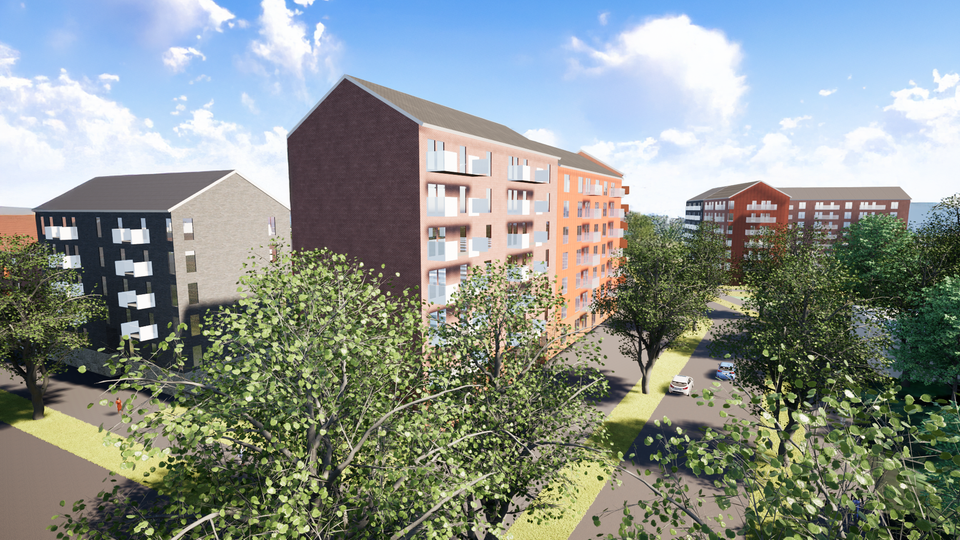 Illustration som visar ett exempel på flerbostadshus längs med Söderslättsvägen.