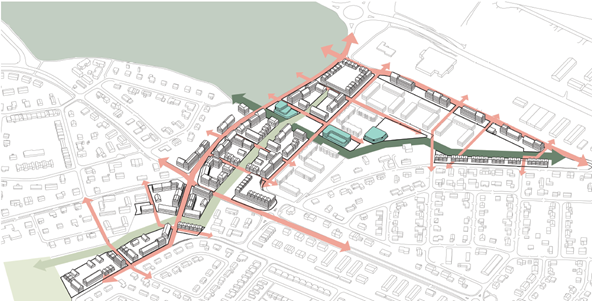 Strukturstudien visar ett övergripande förslag på hur utredningsområdet kan utformas och kompletteras med ny bebyggelse.