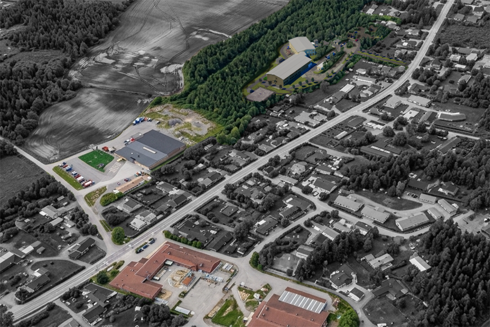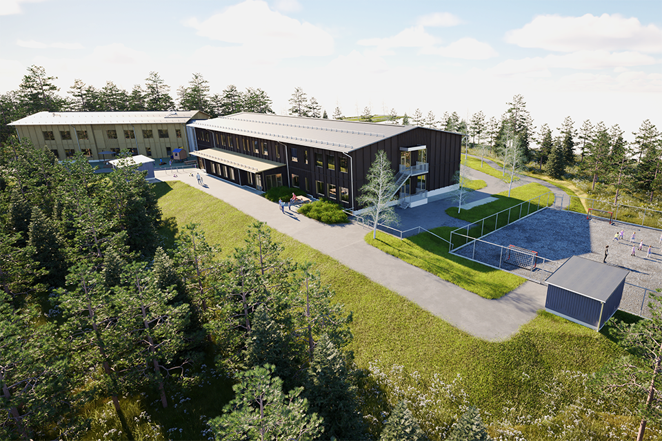 Den nya skolan och förskolans placering (högst upp i bild) i förhållande till aktivitetshuset (till vänster) och den befintliga skolan (längst ned i bild). Illustration: Tyréns