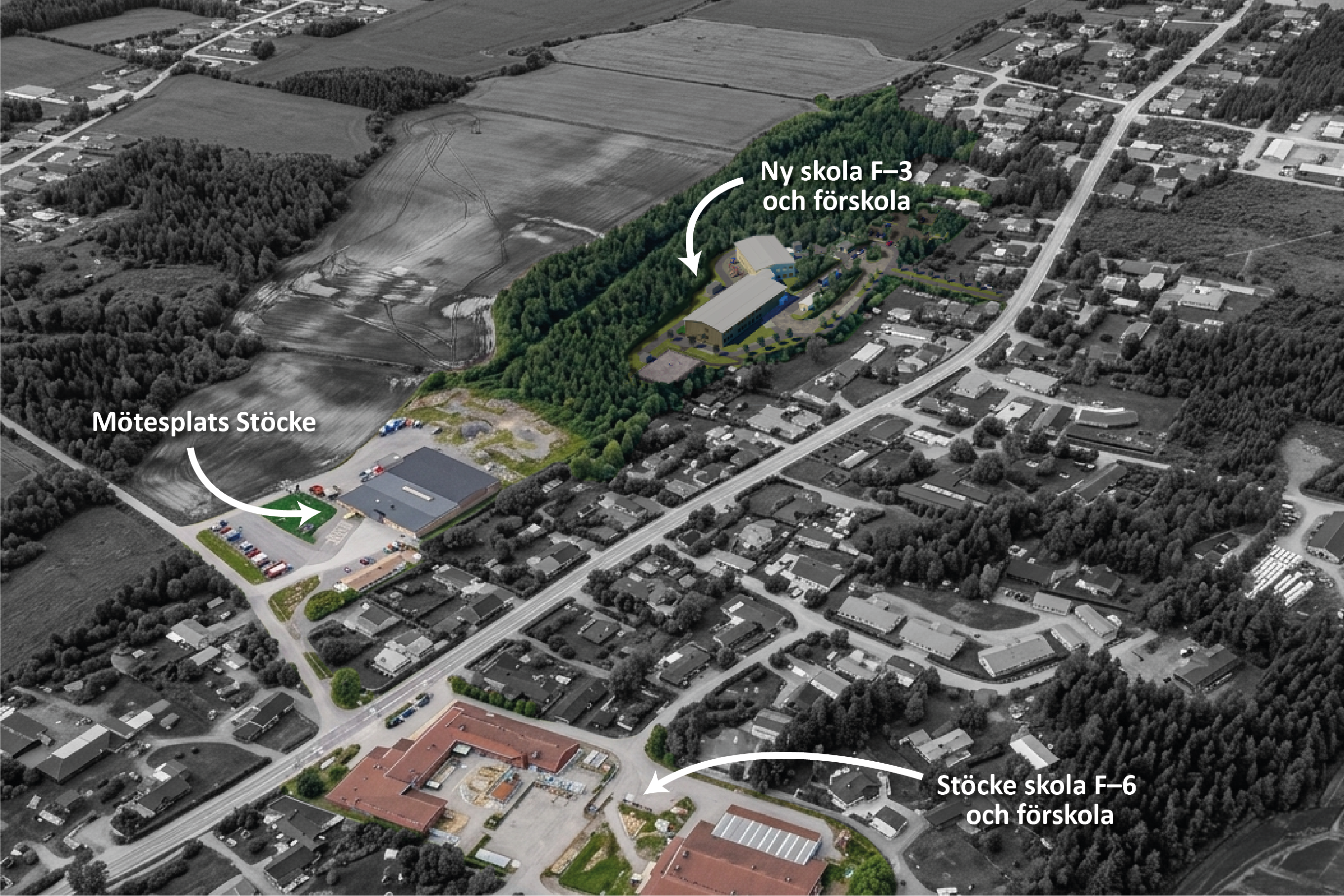 I Stöcke byggs en ny F–3-skola och förskola. Skolan får två paralleller med plats för totalt 200 elever och förskolan kommer rymma sex stycken avdelningar. Skolbyggnaderna byggs i två plan som binds samman med en länk. I länken ryms skolrestaurangen och skolan får även ett tillagningskök.