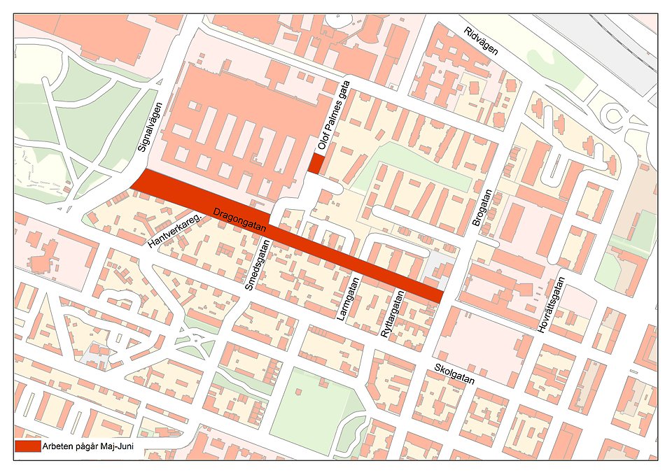 • Andra arbeten som pågår är grävning för kablar mellan korsningen Dragongatan/Hantverkaregatan till Dragongatan/Smedsgatan. Dessa medför mindre störningar men tillgång till infarter är möjlig. Det kan bli kortare stopp när det grävs förbi själva infarten.