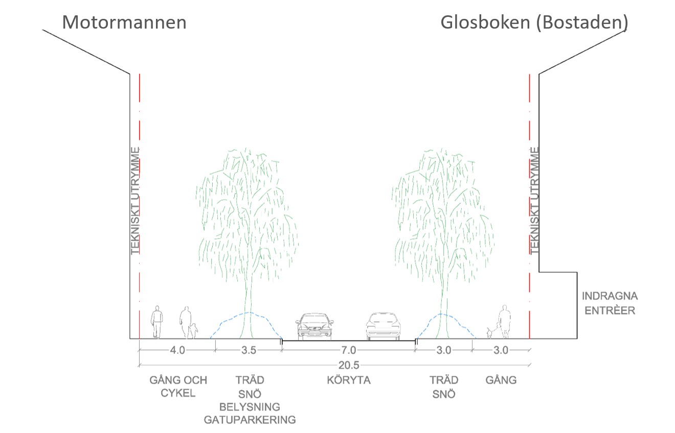 Visualisering av gatans nya utformning vid kvarteret Motormannen och Glosboken.