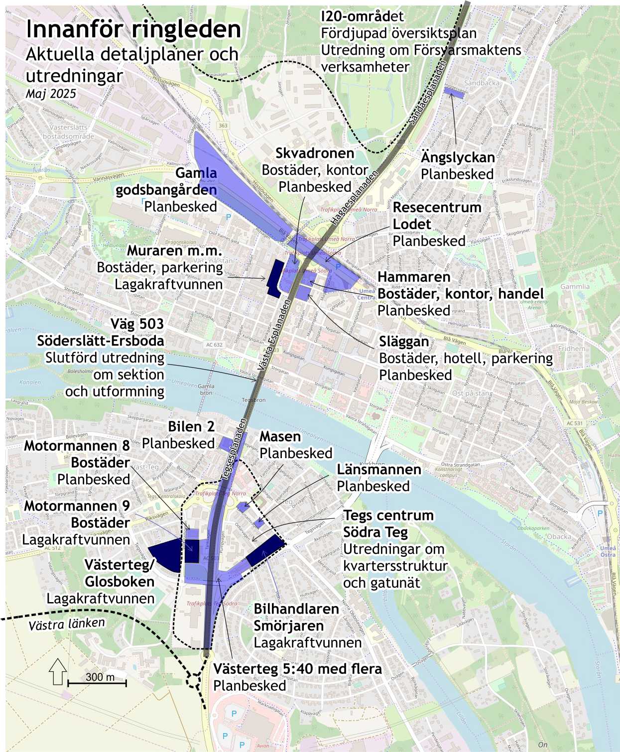 För fastighetsägare, handlare, företagare och boende kommer förändringen att på sikt skapa både trygghet och nya möjligheter för människor att fortsätta utveckla Umeå hållbart. Därför tror vi att intresset från etablerare och fastighetsägare längs stråket kommer att vara stort. Även om vägarna kan byggas först efter att ringleden är färdig så pågår flera projekt som är en del av omvandlingen innanför ringleden. Kartan nedan visar några av de projekt och detaljplaner som pågår innanför ringleden just nu. Några av projekten har egna projektsidor där du kan läsa mer och ta del av olika handlingar. För vissa av projekten påbörjas planarbetet först om ett eller ett par år, mer om det går att läsa på projektsidorna.