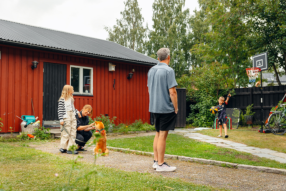 Frida, Fritz och barnen leker på baksidan med sin hund. Foto: Amanda Sveed