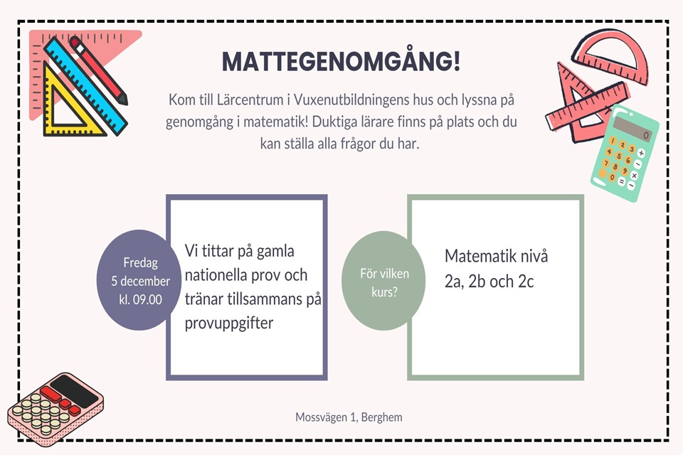 Vi tränar tillsammans på provuppgifter. Nivån är Matematik 2a, 2b och 2c. Datum och tid är fredag 5 december klockan 09.00 på Lärcentrum, Mossvägen 1, Vuxenutbildningens hus.