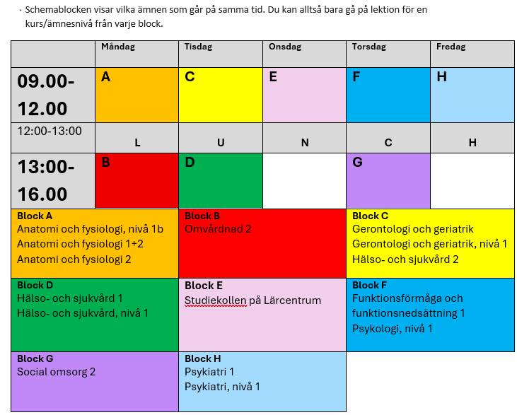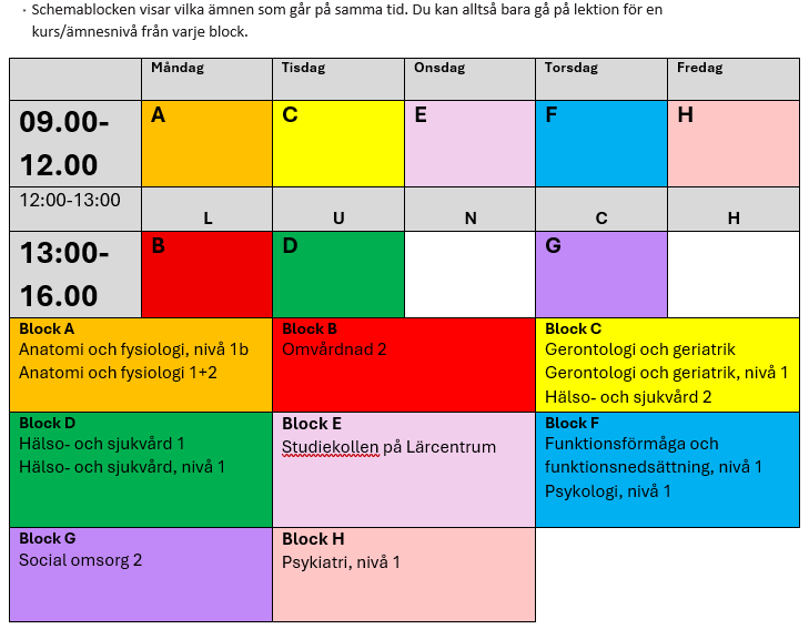 Olika kurser/ämnesnivåer har lektioner under olika tider, du ser det på bilden ovan, på denna länk: Schema