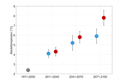 Nedan ser du ett diagram som visar årsmedeltempteratur utifrån de två scenarierna. Det första scenariot RCP 4.5 utgår ifrån att utsläppen ökar ungefär fram till mitten av seklet och minskar därefter då världen lyckas genomföra vissa klimatåtgärder, men inte de mest ambitiösa. I det andra scenariot RCP 8.5 fortsätter utsläppen öka kraftigt under hela 2000-talet.