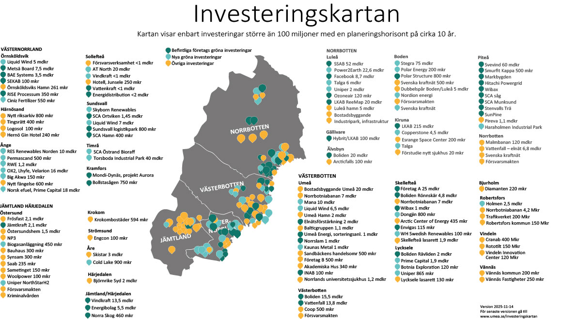 Investeringskartan är framtagen tillsammans med Region Västernorrland, Region Jämtland/Härjedalen, Region Västerbotten och Region Norrbotten tillsammans med Luleå kommun, Skellefteå kommun, Östersunds kommun, Sundsvalls kommun, Örnsköldsviks kommun och Umeå kommun.