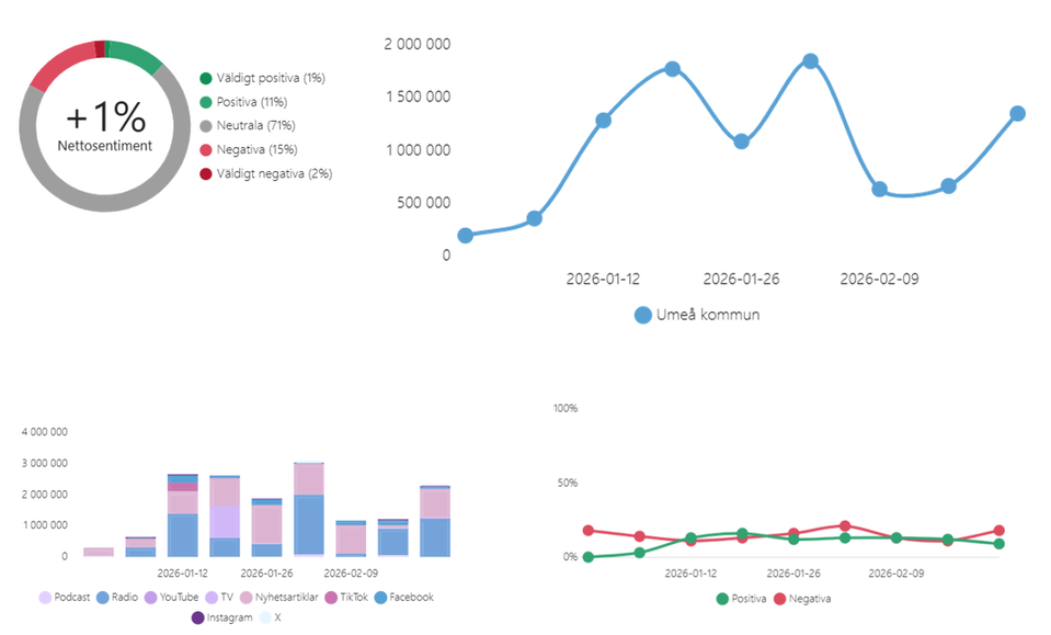 Under perioden 1 januari – 28 februari har Umeå kommun omnämnts 1041 gånger vilket är något mindre jämfört med föregående år. Positivt för 2026 är att klar majoritet är neutral viktat i verktyget. Det betyder omnämnandet är övervägande neutralt. Räckvidden ligger på ungefär samma nivå trots färre omnämnanden jämfört med 2025.