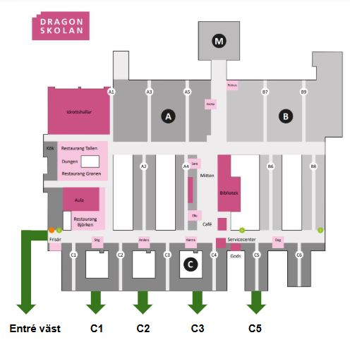 Eftersom vi firar närmare 700 studenter här på Dragonskolan används flera utgångar vid utspringet. Ovanför utgångarna som ligger på skolan södra sida finns skyltar med information om vilka program som springer ut genom repektive utgång (se karta nedan). Anhöriga uppmanas ta sikte på skyltar med programnamn i vimlet, så hittar ni er student enklare.