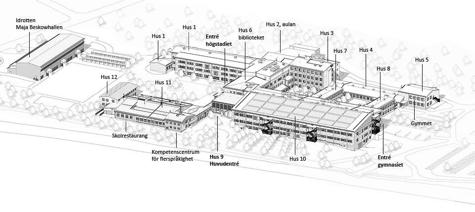 Vi rekommenderar att de elever som skjutsas till/från skolan hämtas och lämnas på parkeringen mellan skolan och Norrlands Universitetssjukhus (med infart från Fridhemsvägen). Parkering kan ske på någon av skolans parkeringar, se karta nedan. Därutöver finns det parkeringar vid Umeå Energi Arena och Sävargården, ca 5 minuters promenad från skolan.