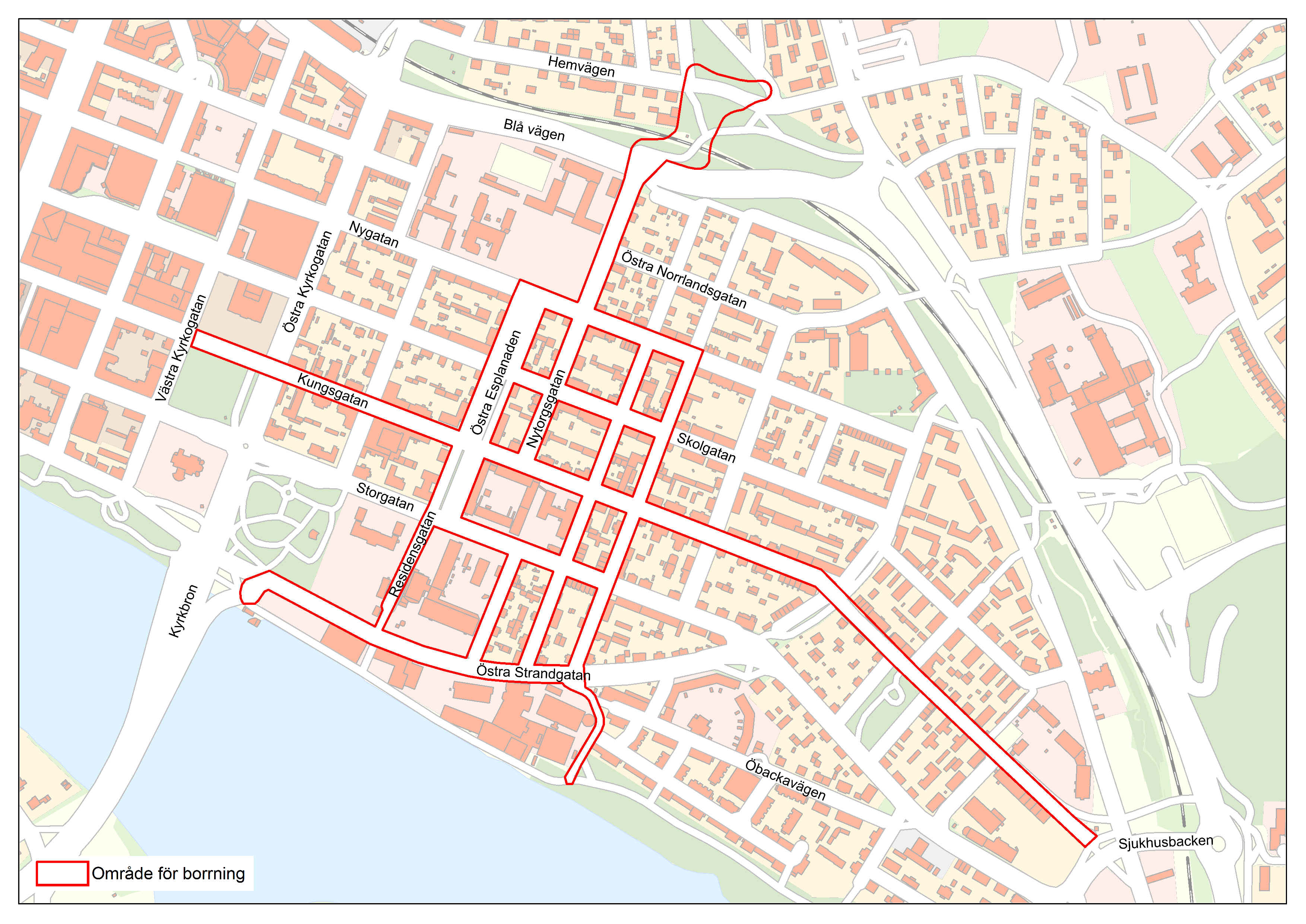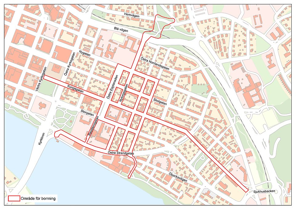 Förstora bildenKartan visar berörda områden för borrningar i stadsdelen Öst på stan inringat i rött.