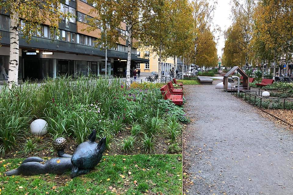 Att tydliggöra årstidväxlingar och att skapa användbarhet året om har varit viktiga mål. Perennplanteringar med en variation från tidig vår till sen höst tillsammans med ett intensivt vårflor och sprakande höstfärg ger ett föränderligt stadsrum. Belysningen bidrar dels till rumslighet och upplevelseden gröna delen men de 7 meter höga belysnings­masterna är också viktiga för att signalera paradgata.