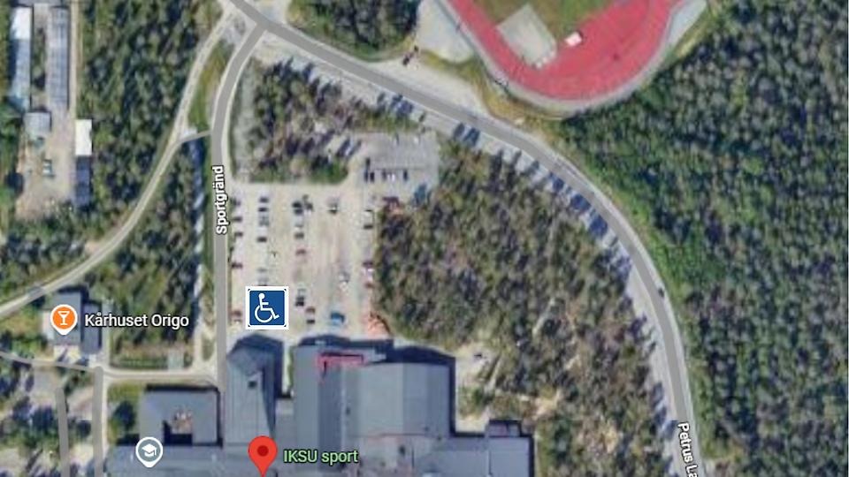 Ta av Petrus Laestadius väg in på Sportgränd, här finns en stor parkeringsplats med flera uppmärkta parkeringsplatser för rörelsehindrade, se kartbild nedan.