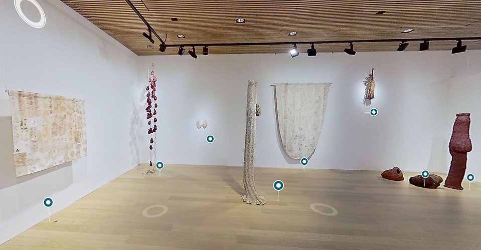 Kanske bor du långt från Umeå konsthall, kanske kan du bara inte få nog av konstupplevelser? Det digitala utställningsrummet gör den aktuella utställningen tillgänglig för dig, när som helst. Ta del av utställningstexten markerad med röd prick eller närma dig konstverken och klicka på de blå prickarna och få mer information. Varmt välkommen in till det digitala utställningsrummet!